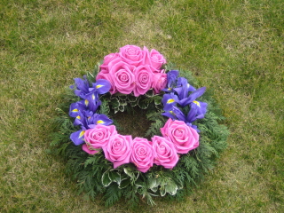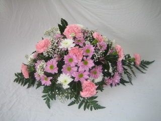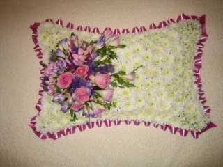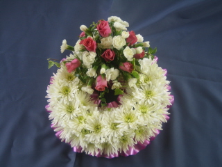 Crosses Ribbon Edge consists of a backgound of white chrysanthemums with spray of flowers of your choice with an attractive edge of matching ribbon.  Other colours available.